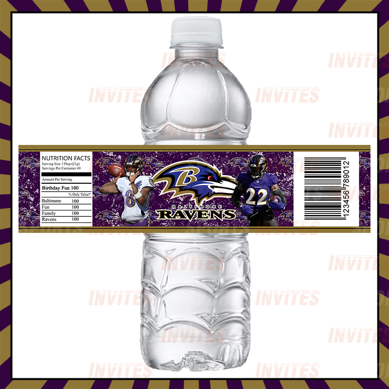 Baltimore Ravens water bottle labels great for Sports Fans of all ages, Birthdays, Save-the-Date, Baby Shower or any Special Event. Each label 2.5×8” and fits 16.9 oz bottles. We are able to adjust the size for mini bottles, wine bottles, etc.