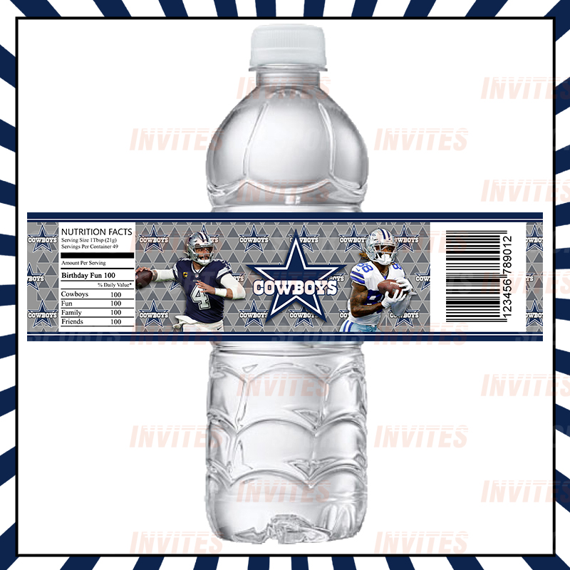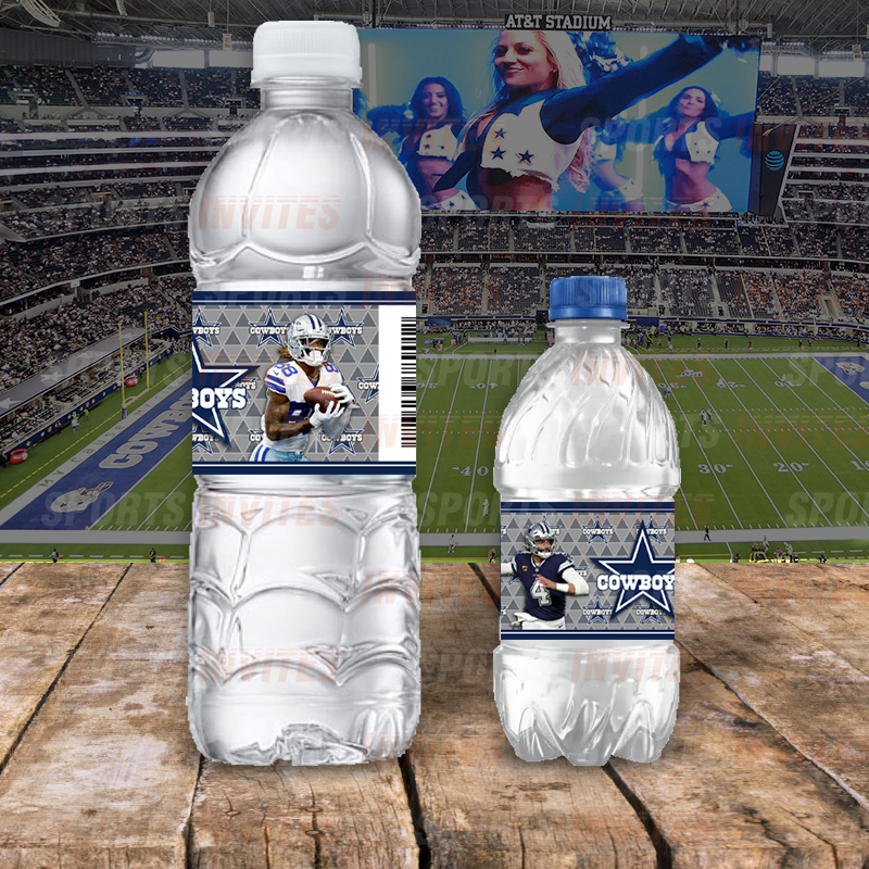 Dallas Cowboys water bottle labels great for Sports Fans of all ages, Birthdays, Graduation, Baby Shower or any Special Event. Each label 2.5×8” and fits 16.9 oz bottles. We are able to adjust the size for mini bottles, wine bottles, etc.