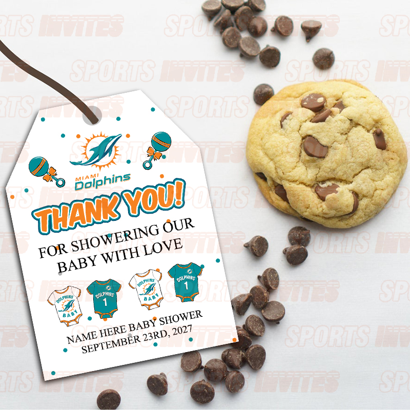 Make a statement at your baby shower, sprinkle or announcement with this decorative Miami Dolphins favor tag design. Your guests will be excited to attend this party. A great party ends with an AMAZING party favor. 100% customizable.