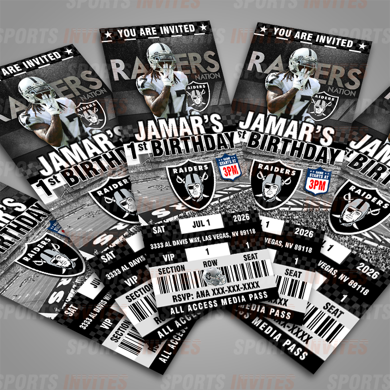 These Las Vegas Raiders Football Invitations are great for Sports Fans of all ages, Birthdays, Save-the-Date, Baby Shower or Wedding Invitations! We can customize it to your favorite team and modify the colors.