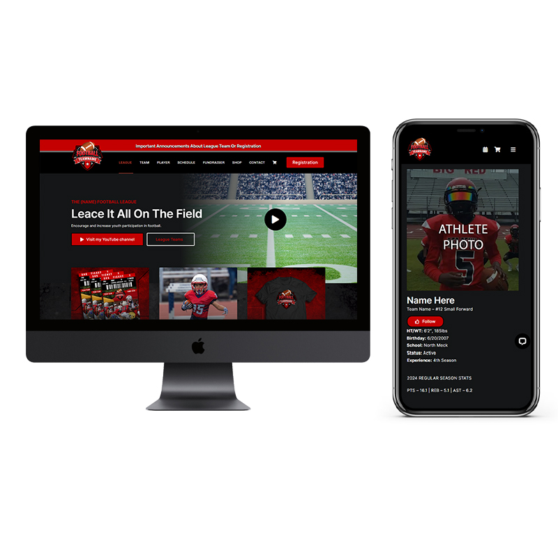 Structured for entire leagues, Individual Teams and Players. Everything has been PREBUILT ready for you to drop in your Branding Stats and Content. Sports Invites Student-Athlete Football Sports Website is great for all ages! We can customize it to your favorite team and modify the colors.